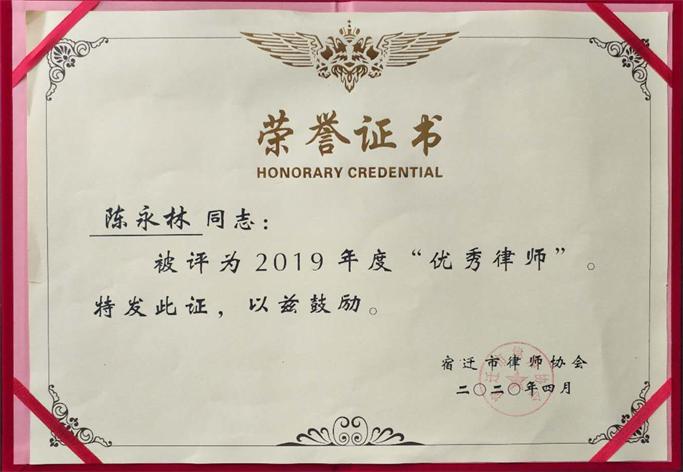熱烈祝賀陳永林律師被宿遷市律師協(xié)會授予2019年度宿遷市優(yōu)秀律師榮譽稱號